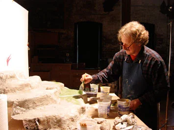 The dinosaurs were displayed on a mountain structure made out of paper mache. I used green, brown, and gray water-based paints to create the rock-like surface.