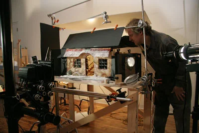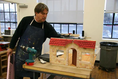 Carvable foam came to life as stone and wood when model maker Michael Lokensgaard shaped and painted the larger scale face of the house seen in Down the Chimney.